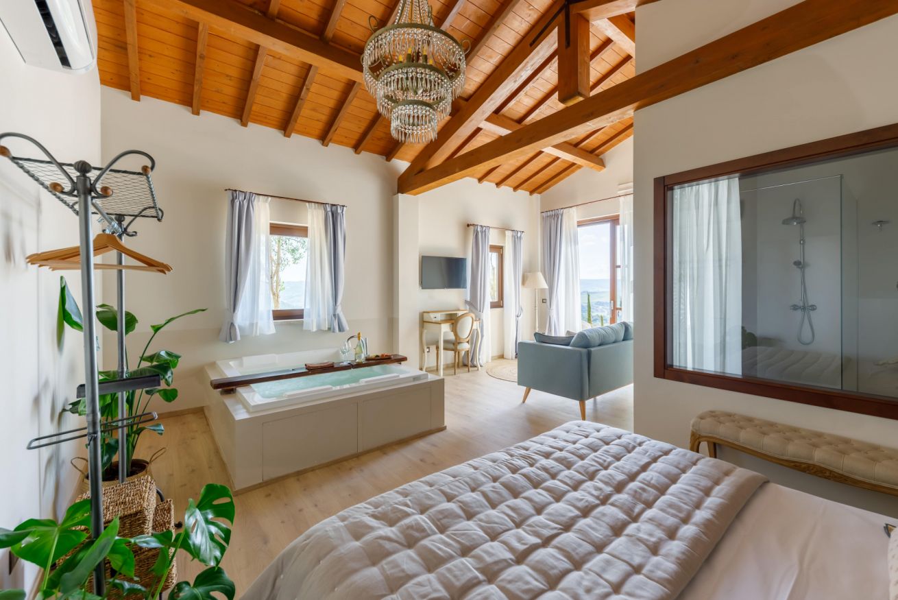 La Suite Chardonnay è una delle stanze più lussuose della nostra tenuta in grado di offrire un'esperienza indimenticabile e rigenerante. Progettata e arredata con uno stile unico e rilassante, con colori pastello delicati e naturali, Open-space con salottino, bagno privato completo di ogni comfort e una meravigliosa vasca idromassaggio Jacuzzi, all’interno della stanza, posizionata sotto una grande finestra, dalla quale è possibile godere della spettacolare vista sulla Rocca di Orvieto mentre si viene coccolati dalle diverse intensità di idromassaggio e dalla cromoterapia.