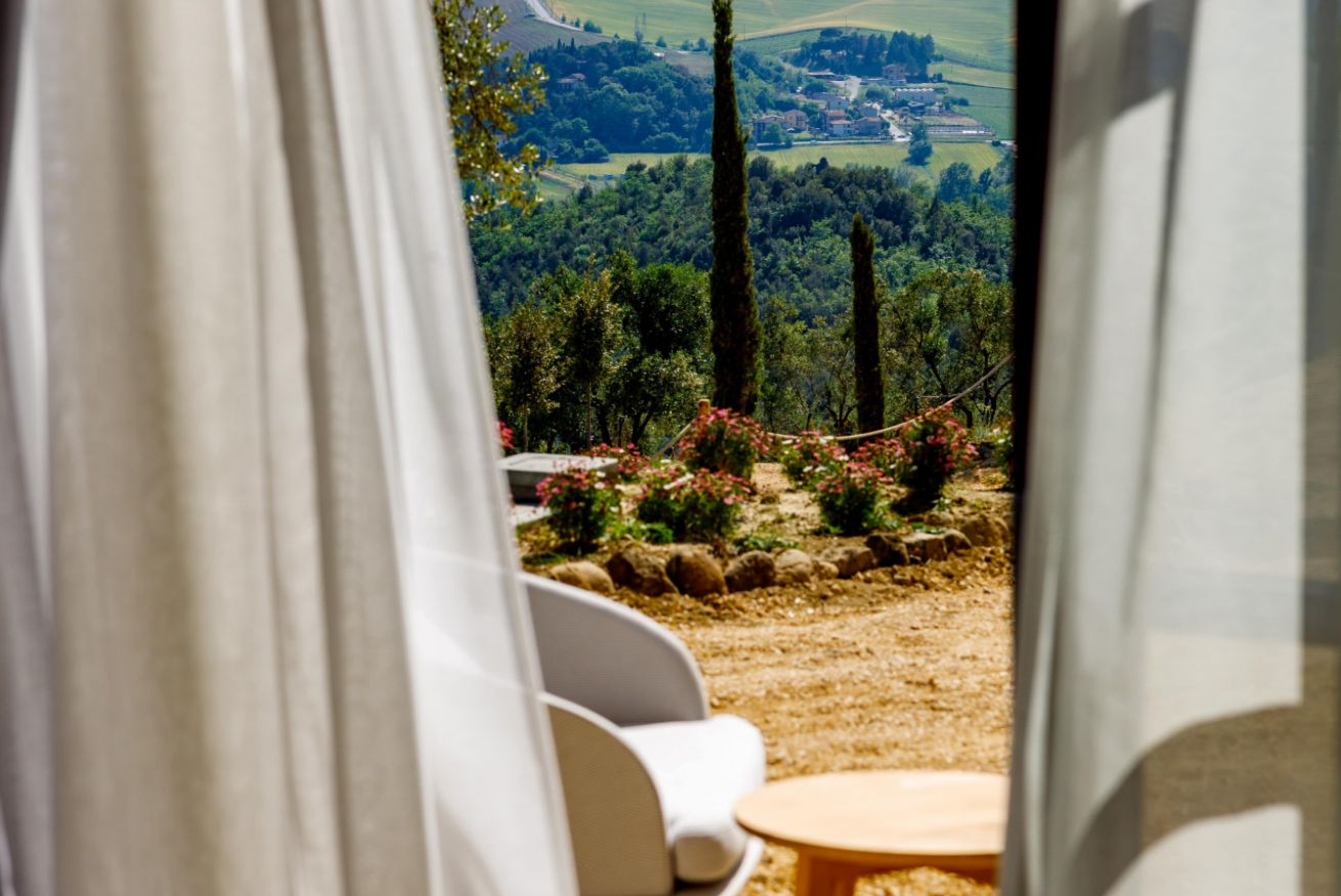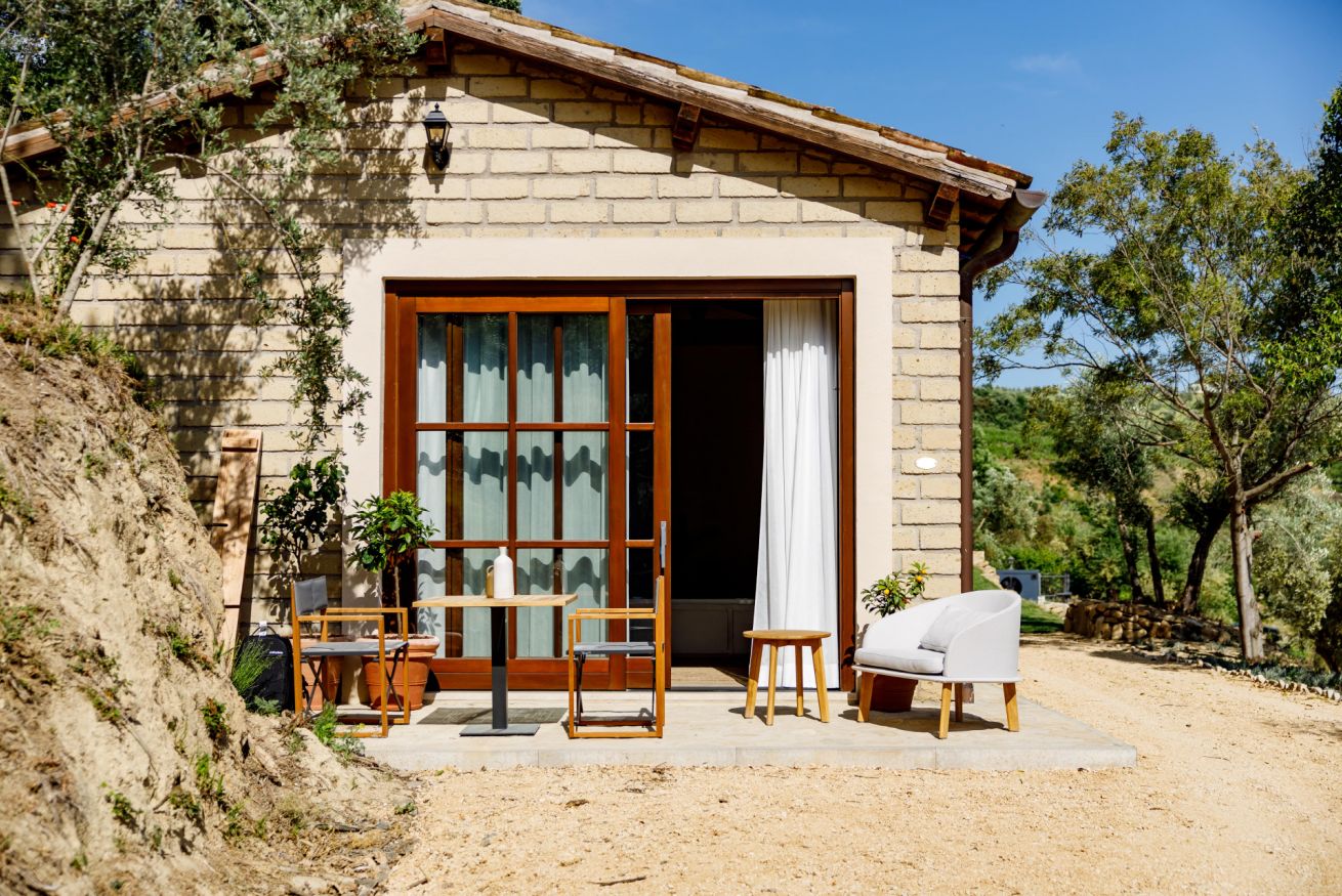 La camera include: bagno privato con doccia, letto matrimoniale, area esterna privata e finemente arredata, completa di ogni comfort e con vista sulla tenuta e sulla Rocca di Orvieto, vasca Jacuzzi con cromoterapia, mantenimento temperatura acqua e diverse intensità di idromassaggio.