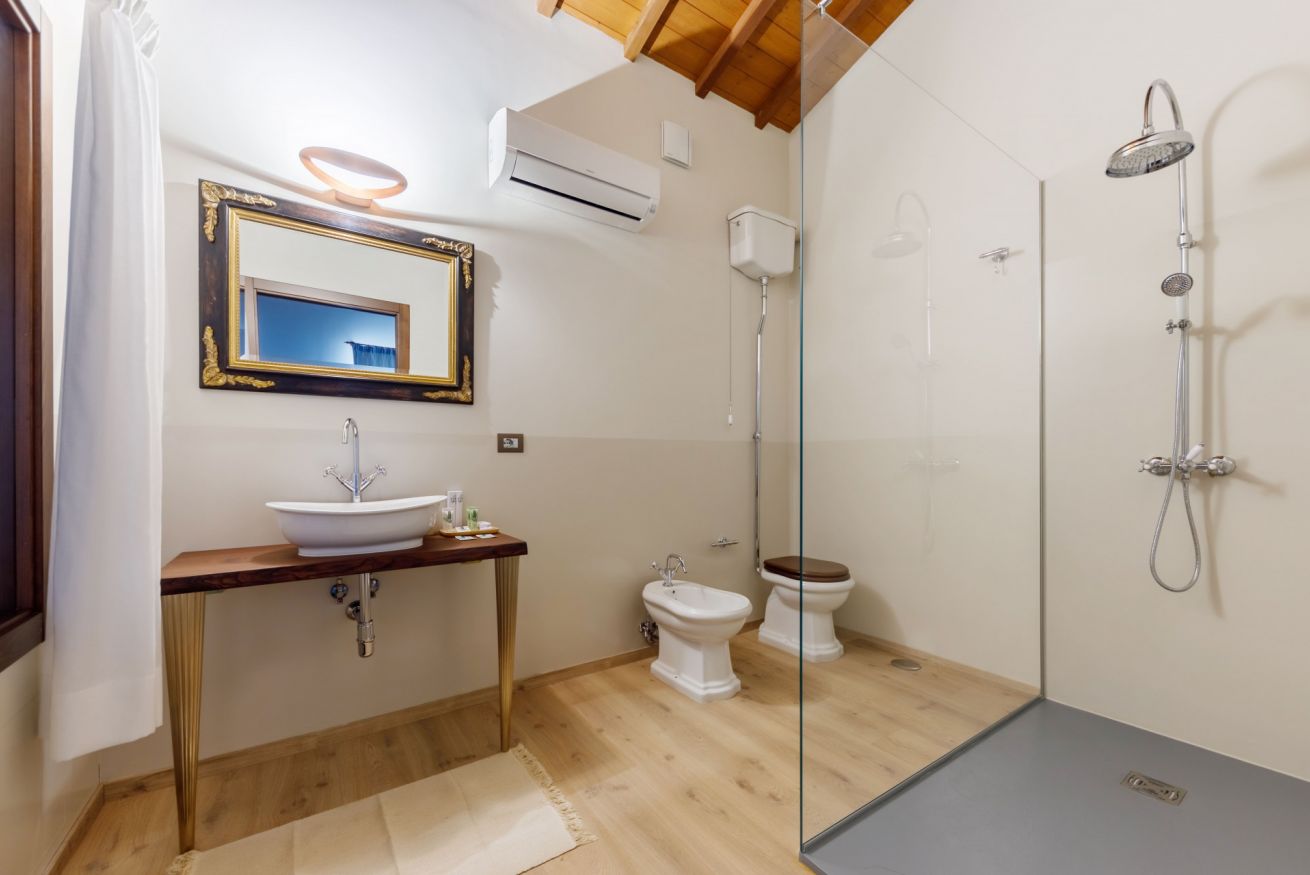 Inoltre la Suite dispone di: WiFi, aria condizionata, riscaldamento, zanzariere, smart Tv, cassaforte, bollitore elettrico, macchinetta Nespresso con cialde, frigo bar gratuito, asciugacapelli, biancheria per piscina e Bag con ciabattine e Kit bagno biologico all’olio di oliva.